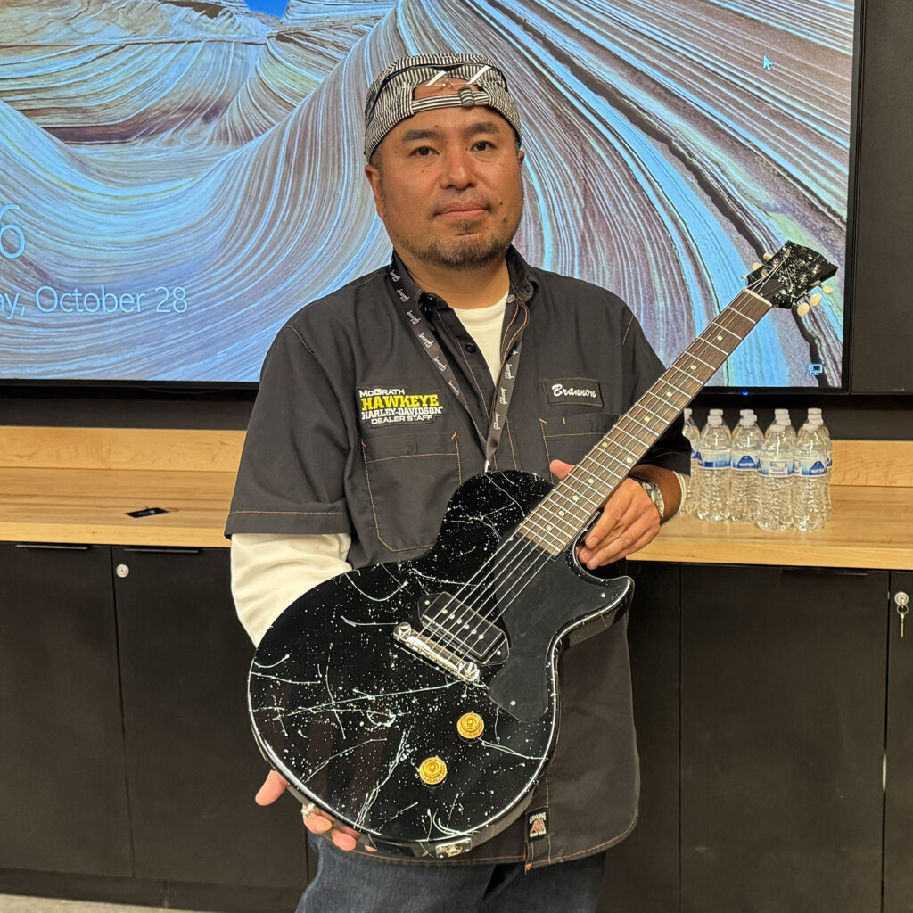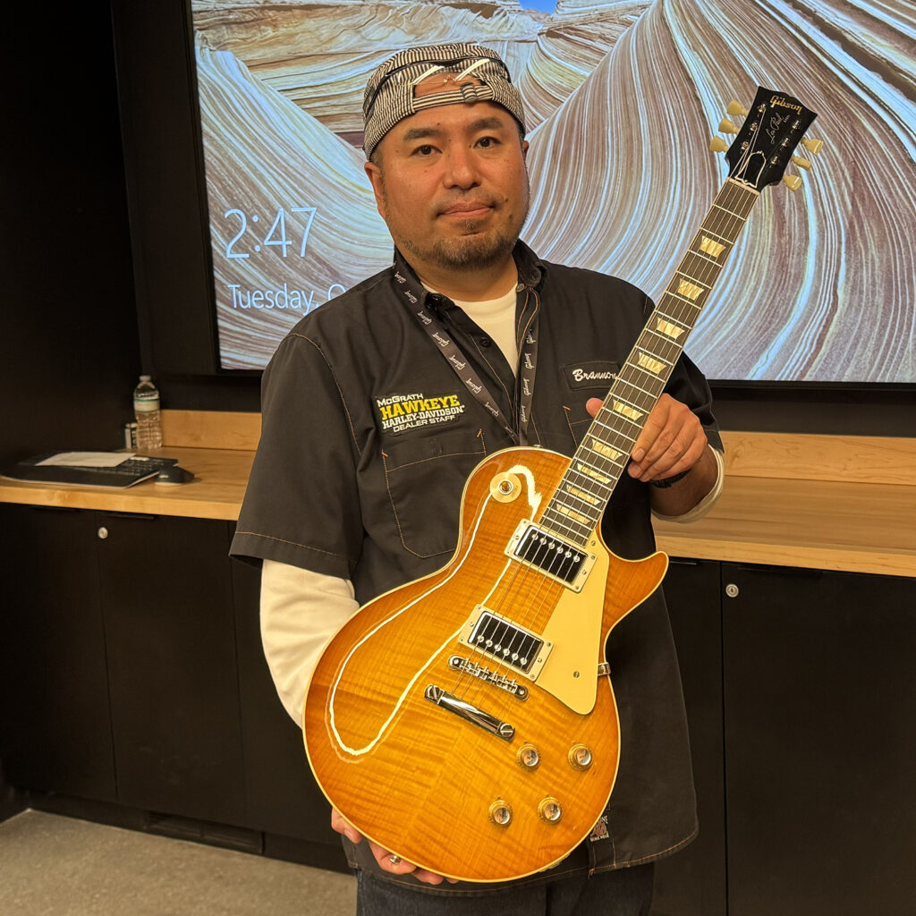 光が当たる角度によりそのカラーを変化させるホットロッドカーを思わせる1本!Custom MTM Program DirectorのDustin Wainscott氏が「クールだろ?でもピックガードを付けてもカッコ良さそうだな、ケースに入れておくよ!」と急遽サービスしてくれました!ありがとうダスティン!