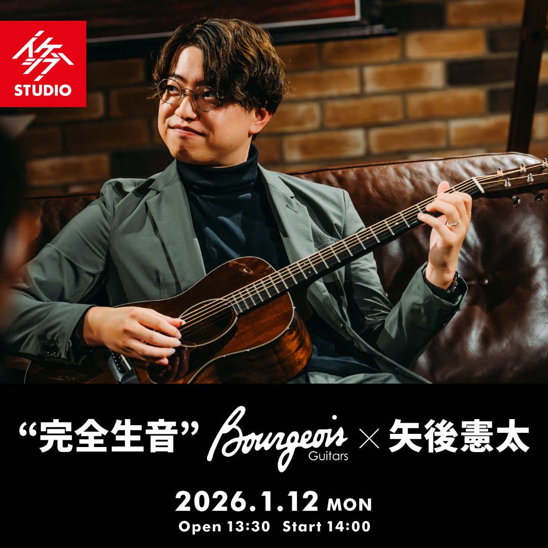 演奏のみに集中することができる「イケシブSTUDIO」の特別な環境に、矢後さんの“生音”での演奏を乗せて、Bourgeois Guitarsの極上サウンドをご堪能ください。