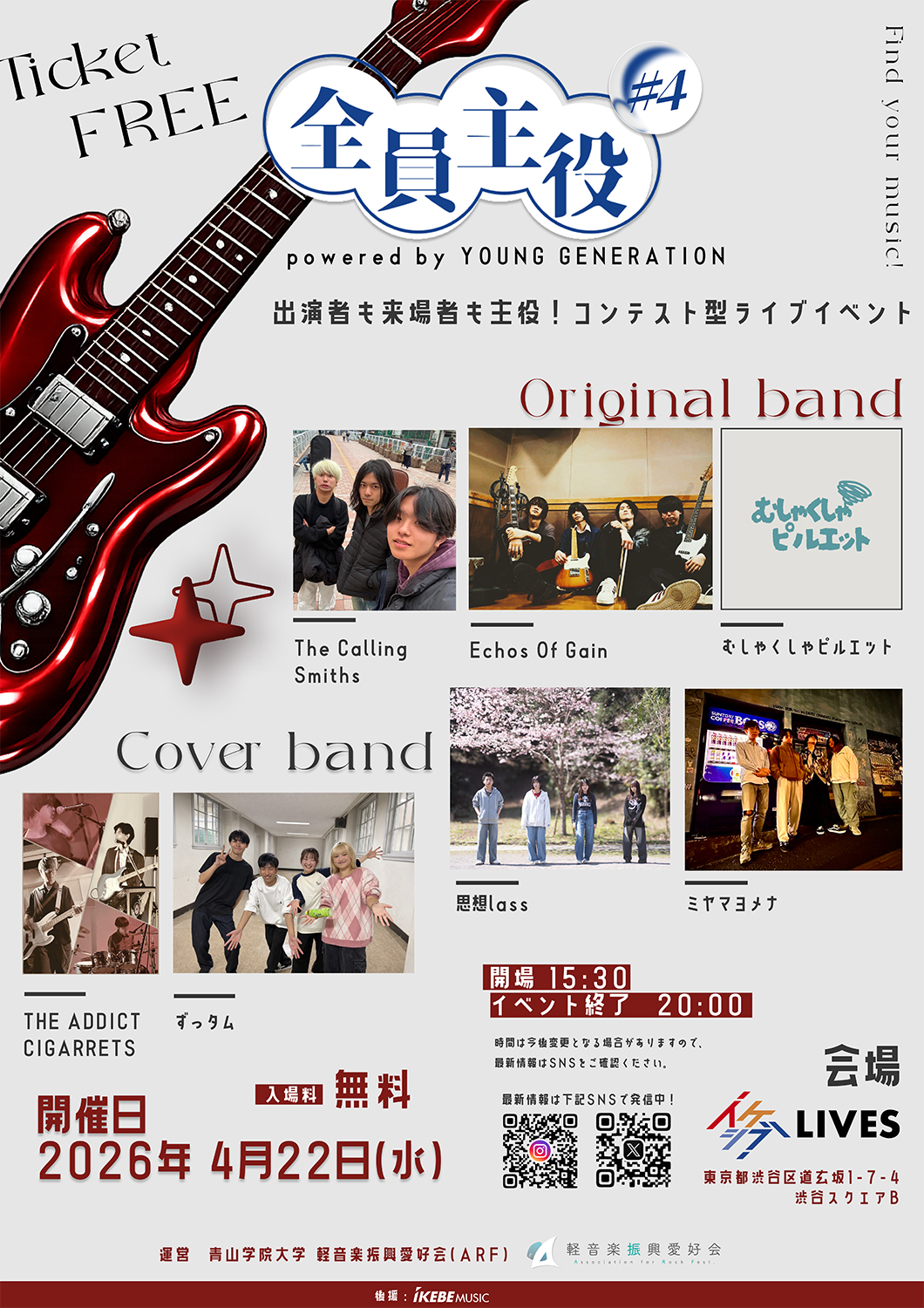 池部楽器店と青山学院大学の軽音楽部サークル・ARFが共同で主催する、学生による学生のための学生ライブ、『全員主役 #4 powerded by YOUNG GENERATION』。2023年にスタートした本イベントもついに4回目!