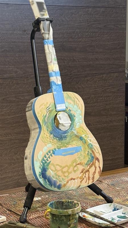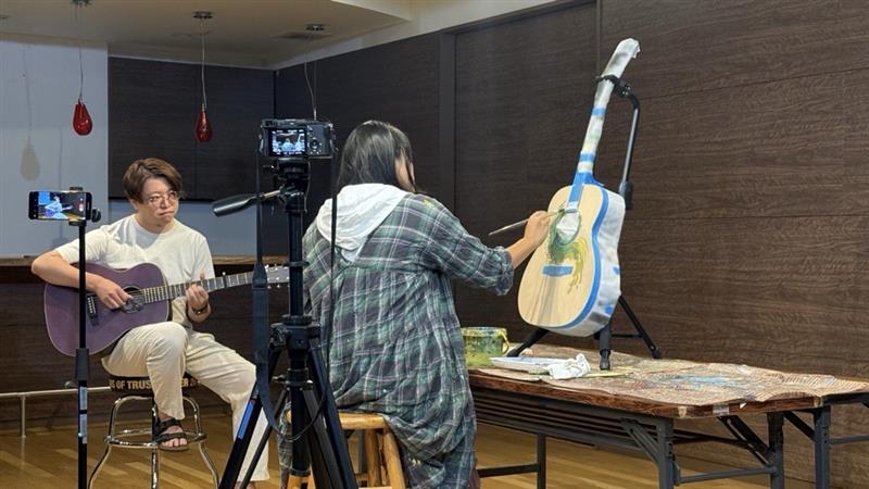 音楽と絵画、二つの表現がリアルタイムで交差する特別企画。ギタリスト・矢後憲太の生演奏に合わせ、絵描き・いくらまりえがアコースティックギターの表板をキャンバスに筆を走らせます。