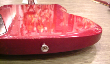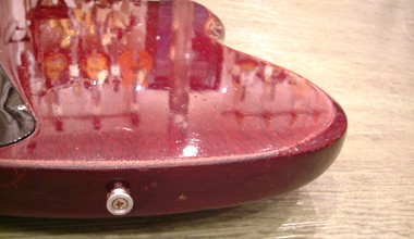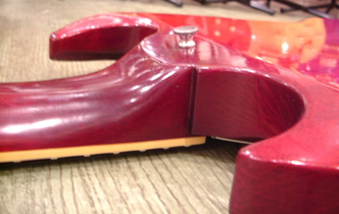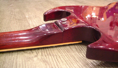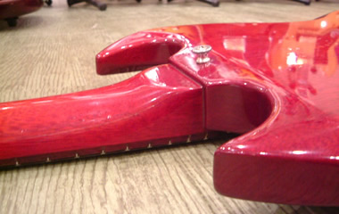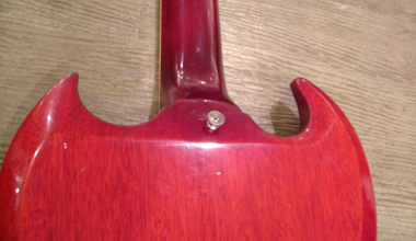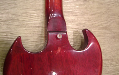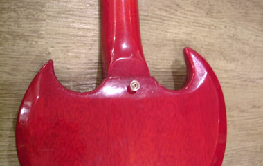 61年製のバック面ジョイント付近及びツノの部分です。非常に滑らかな加工が施され、ツノもしっかりと尖っています。ストラップピン付近の傾斜面積も大きく、まるでスル-ネックのようですね。
