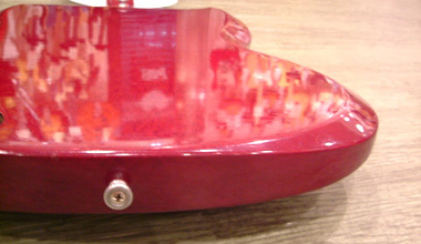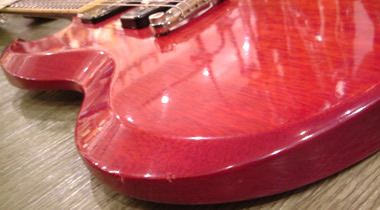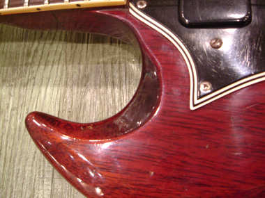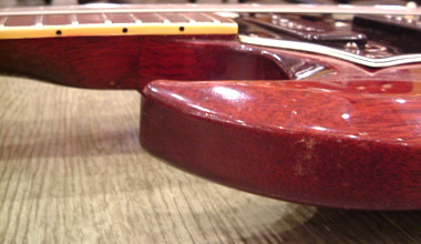 67年製のカッタウェイ部分です。61年製、67年製と比べてボディエッジが丸まり、ベベルド・コンターの削り面積がかなり少なくなっています。