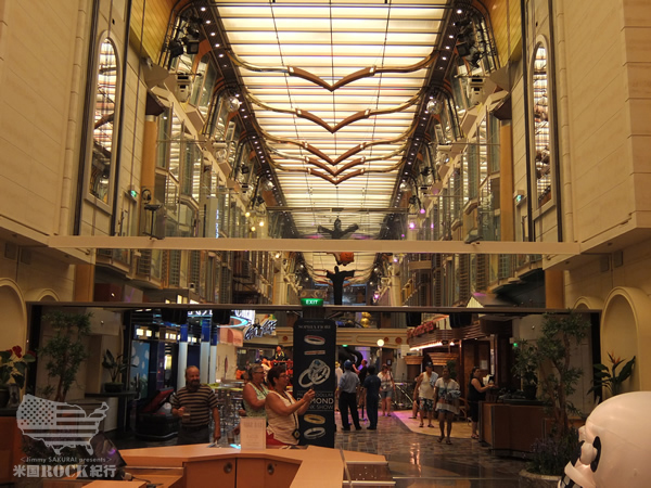 ライヴの会場となるのは、5千人も乗せられる大型客船。内部はちょっとしたショッピングモールのような作りで、ブランドショップをはじめ、いろんな種類のカフェやバー、レストランも充実しています。およそ15階くらいある建造物の屋上デッキには、いくつかのプールやジャグジー、アミューズメント施設も備えられています。