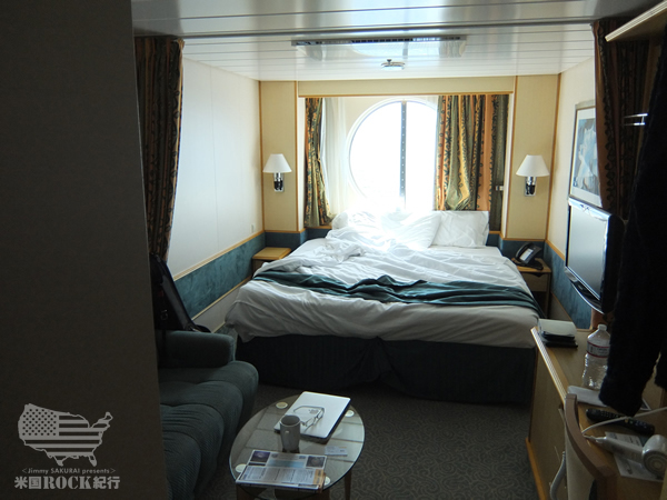 仕事とはいえ、僕らのように短期で乗り込むバンドはゲスト(乗客)という扱いなので、一般の客室を割り当ててもらえます。客室の様子はダブルベッドが部屋の約半分を占めていて、あとはクローゼットと二人掛けのソファに使い易いユニットバスがあるだけですが、二人程度でステイするなら充分快適な空間です。航行中の船内は殆ど揺れを感じません。時折大きな揺れがありますが船酔いしてしまうということはありません。