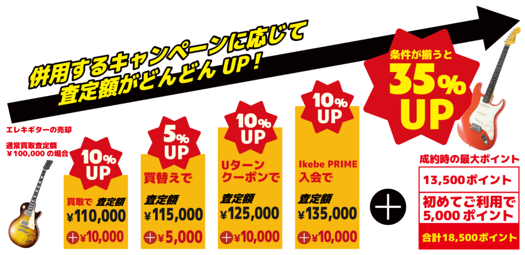 初めてイケベリユースをご利用の方限定!キャンペーン期間中、イケベミュージッククラブに登録し、イケベリユースWEBサイトから楽器・機材の買取査定をお申し込みのうえ、買取、または買い替え(下取)をご成約いただいた方に 5,000ポイントプレゼント!