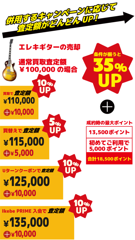 イケベプライム会員は、通常の買取金額から査定額が10%UPに。しかも他の買取強化キャンペーンと合わせて利用することができますので、さらにお得!